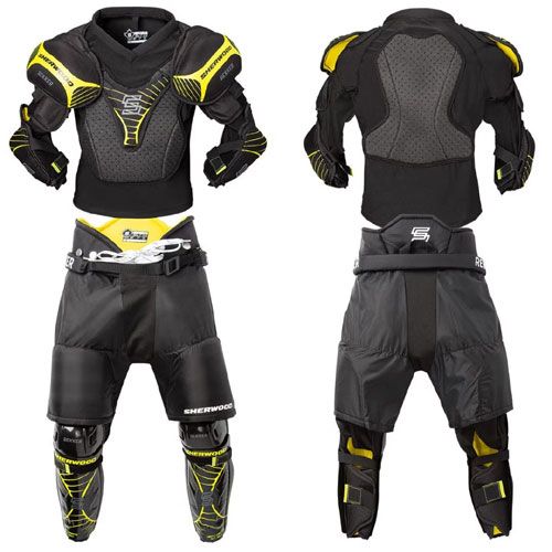 The Sherwood Rekker Elite Youth Hockey Protection Kit is designed for new hockey players to simplify their dressing room experience. Two piece kit includes a top baselayer with integrated shoulder and elbow pads. The bottom piece includes hockey pants with integrated shin guards, jock and jill protector and hockey sock Velcro tabs on shin guards. Both pieces have a comfortable inside liner.